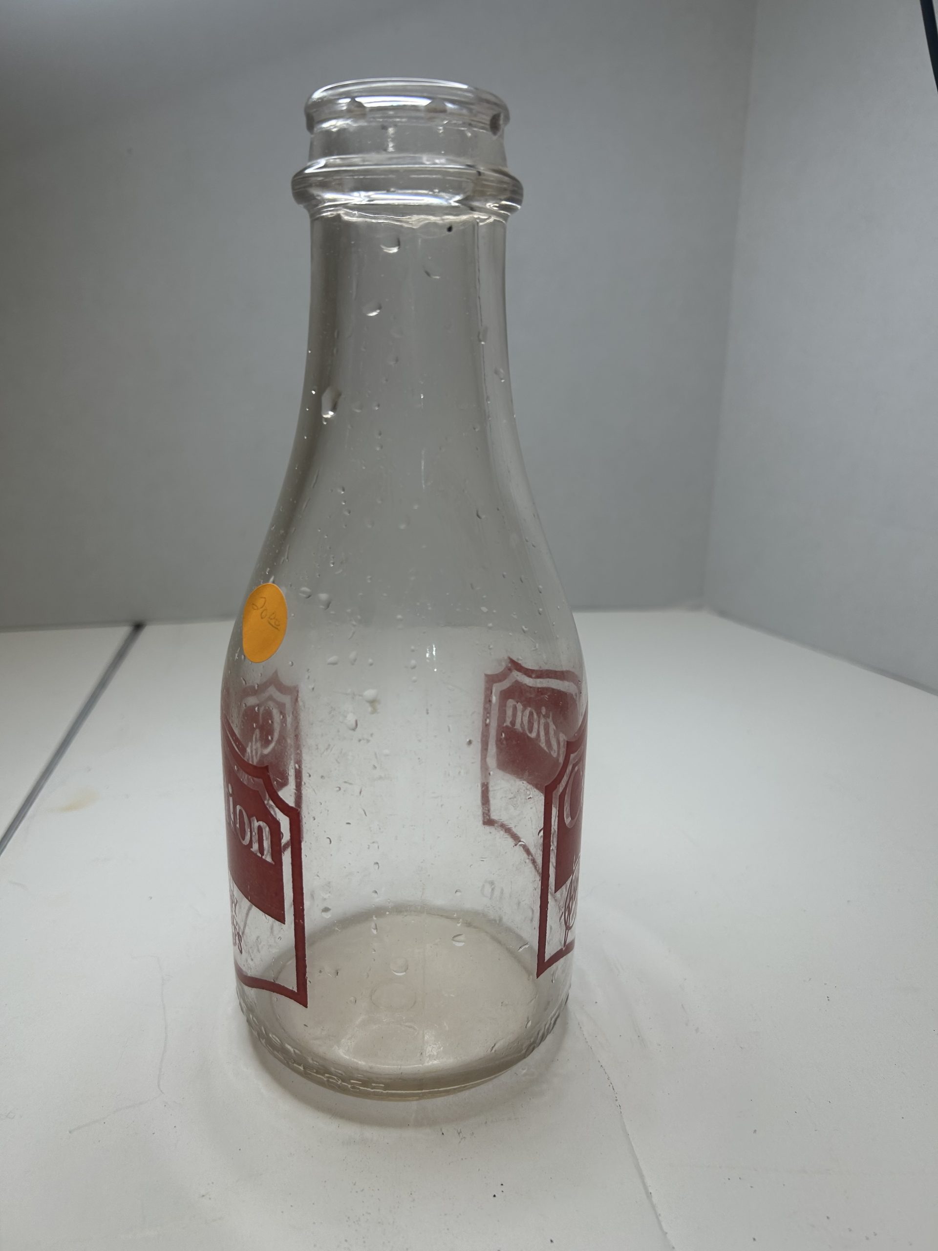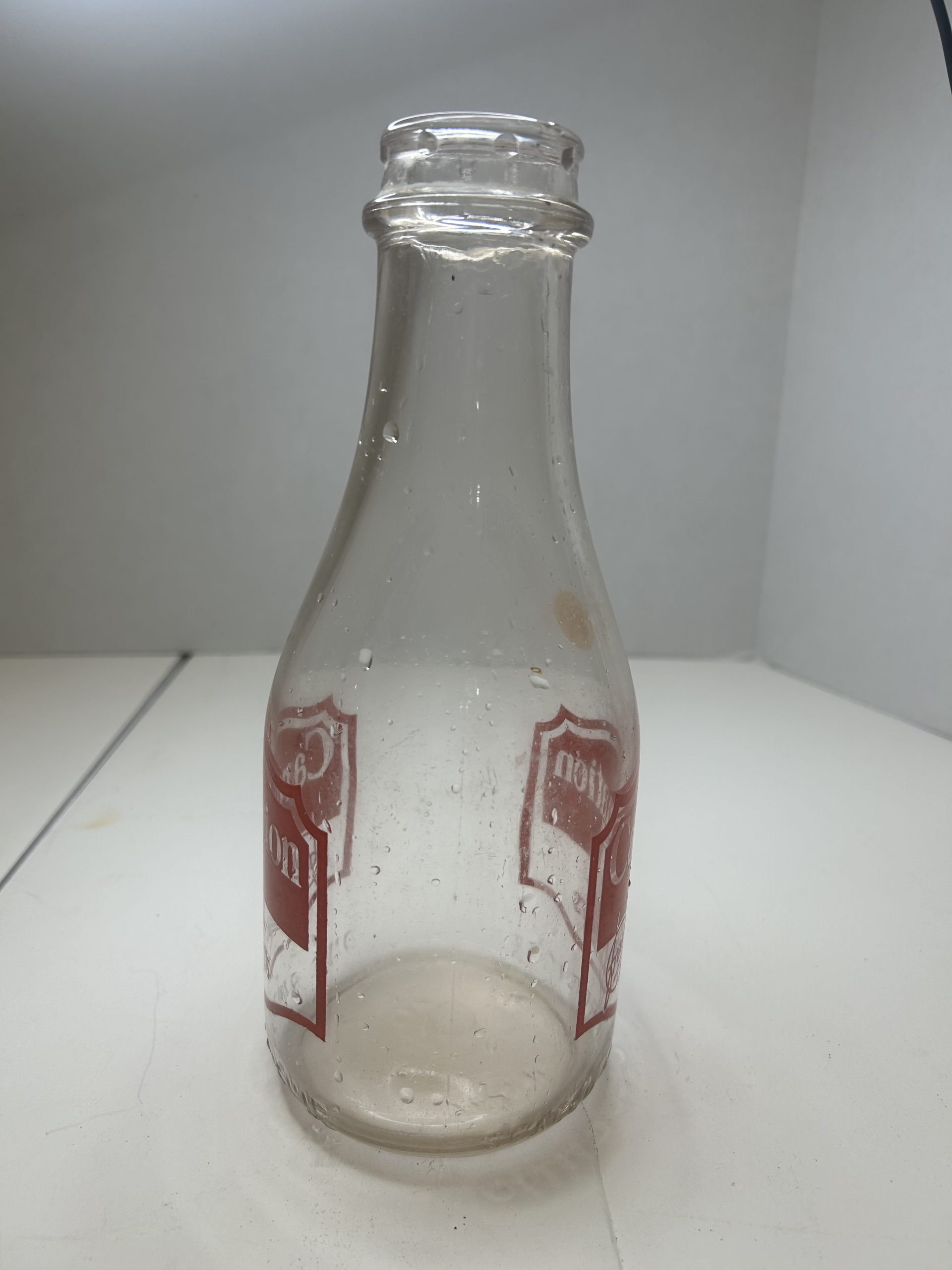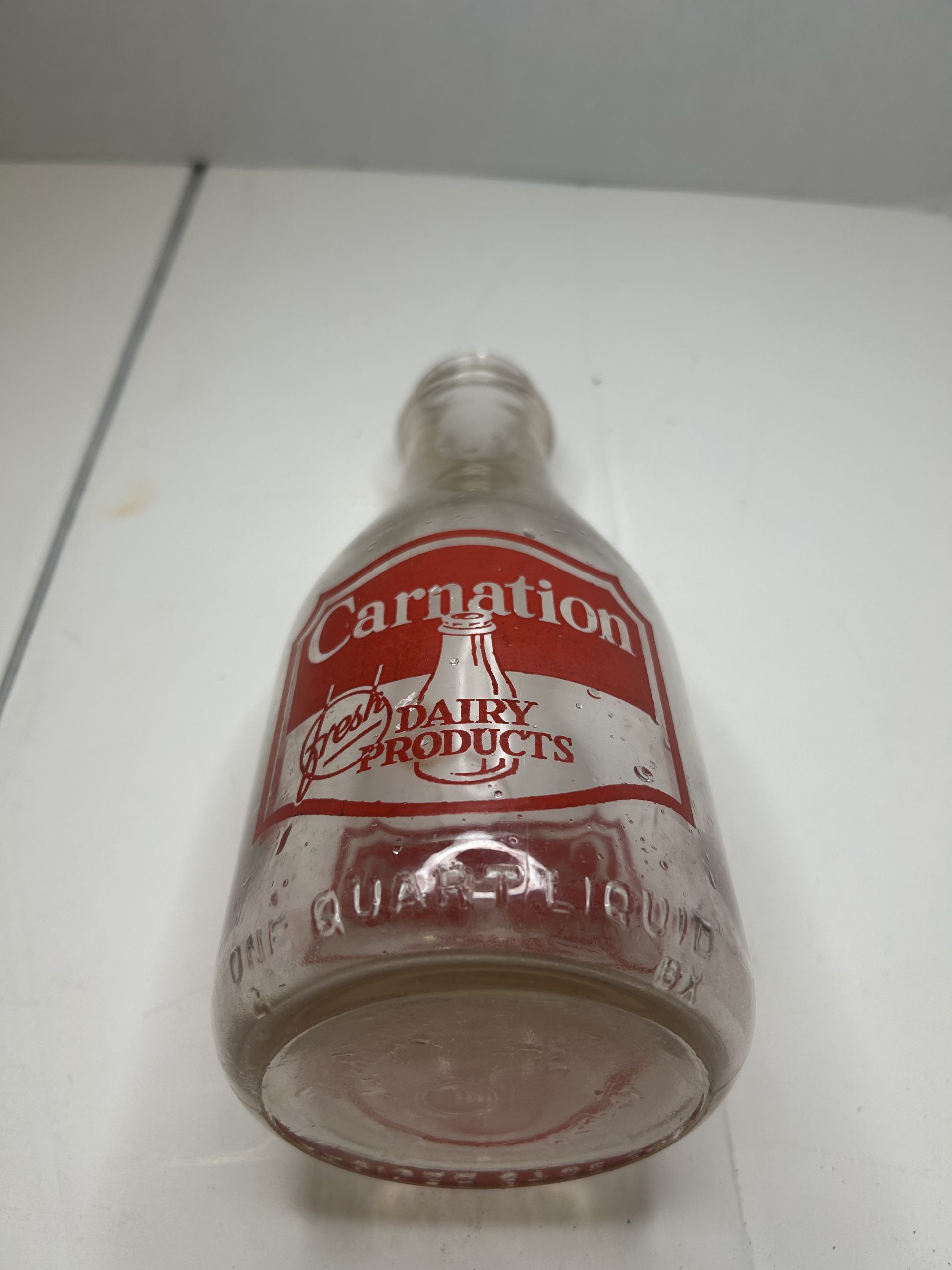 1947 Carnation Fresh Dairy Products Glass Quart Bottle for sale. Excellent condition. glass with red label and cut out “Carnation” text.