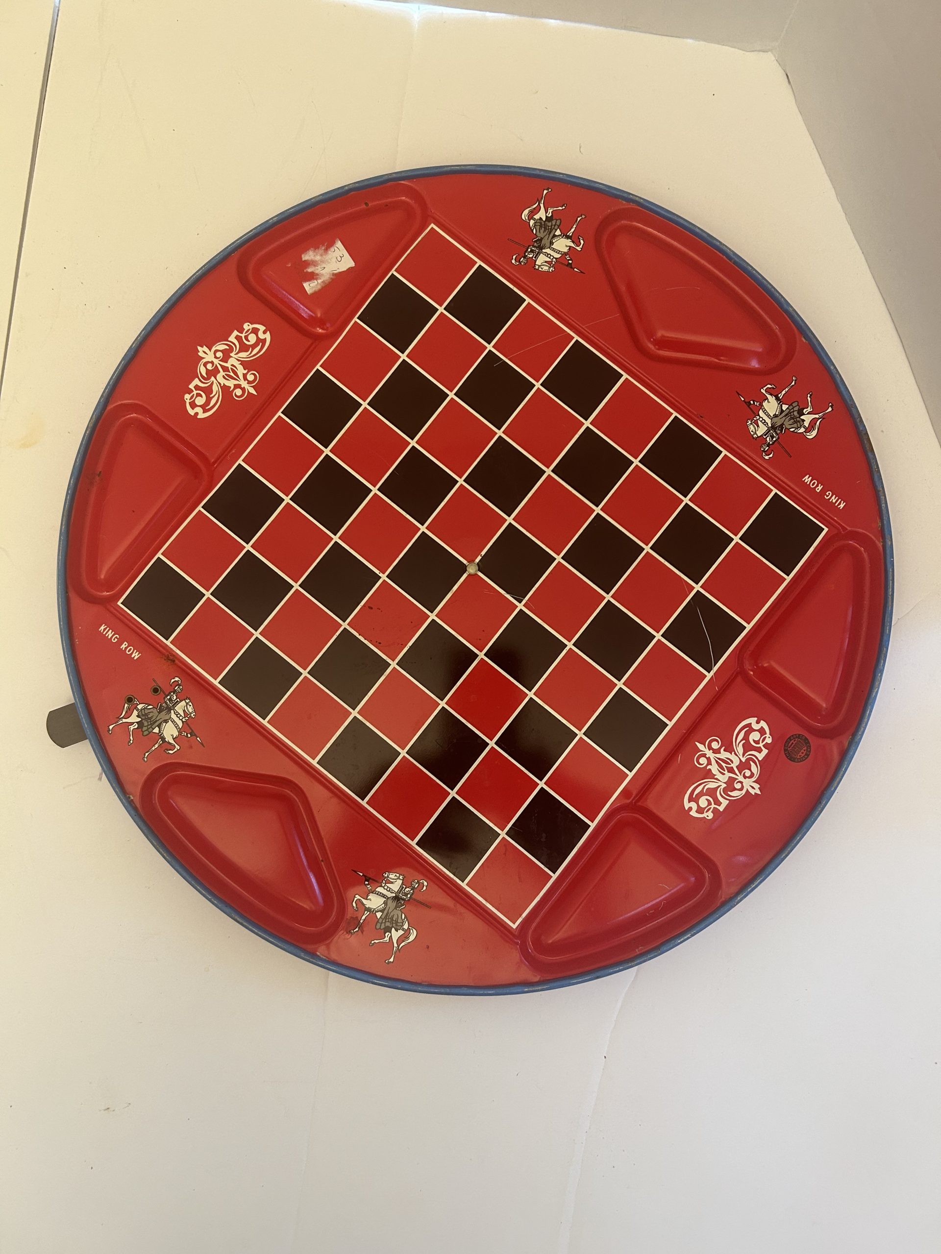 1953 Vintage Chinese Checkers Game Set for sale. Excellent condition with marbles and game tokens included. 16 inches round with colorful painted metal. $59 plus shipping and handling.