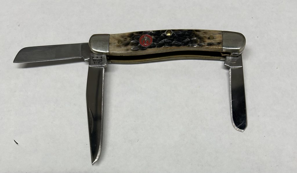 A Case XX 3-blade Copperhead with a red shield, such as the CA10605 “Merry Christmas” model, typically measures approximately 3.88 inches long when closed and weighs around 3.8 ounces. This size is for a specific model, so other “3-blade Copperheads” may vary.