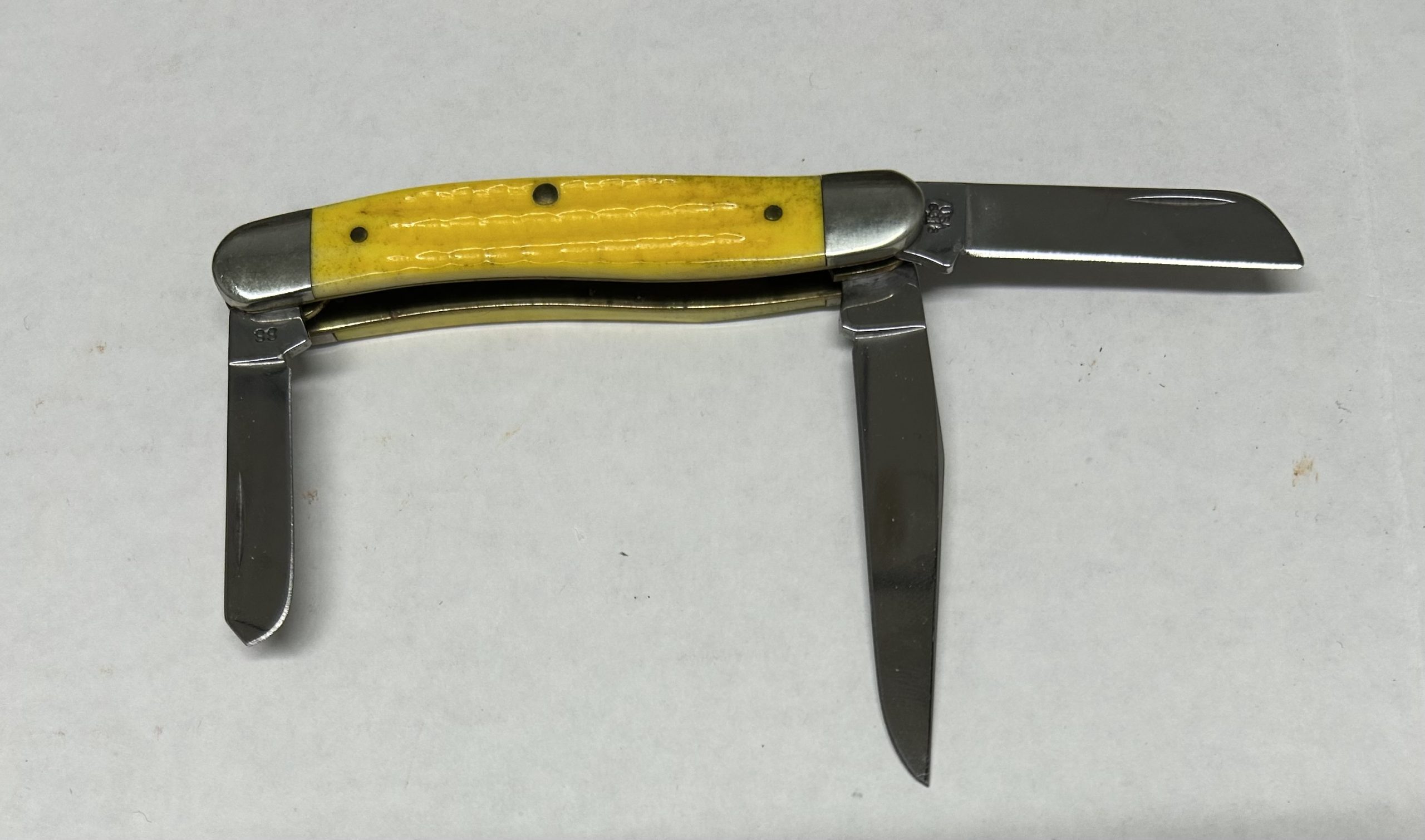 Case XX John Deere pocket knife yellow bone large stockman for sale. This knife features a yellow bone handle and the specific “Large Stockman” pattern. $60 plus shipping and handling.