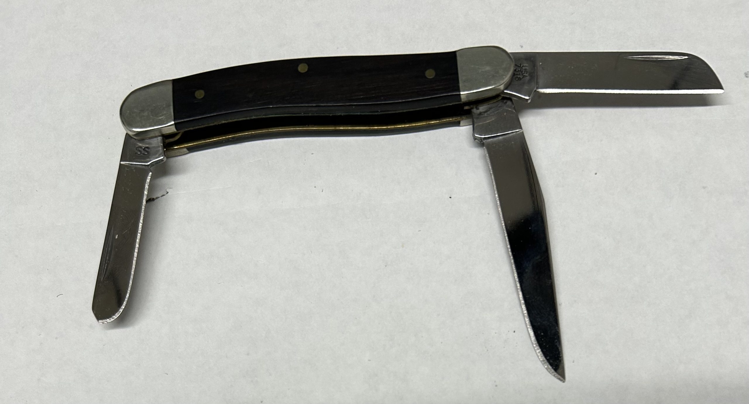 Case XX Stockman black pocket knife folding 3-blade measures approximately 3.63 inches closed with three blades with lengths of 2.57, 1.88, and 1.71 inches and weighs 2.5 ounces. $60 plus shipping and handling.