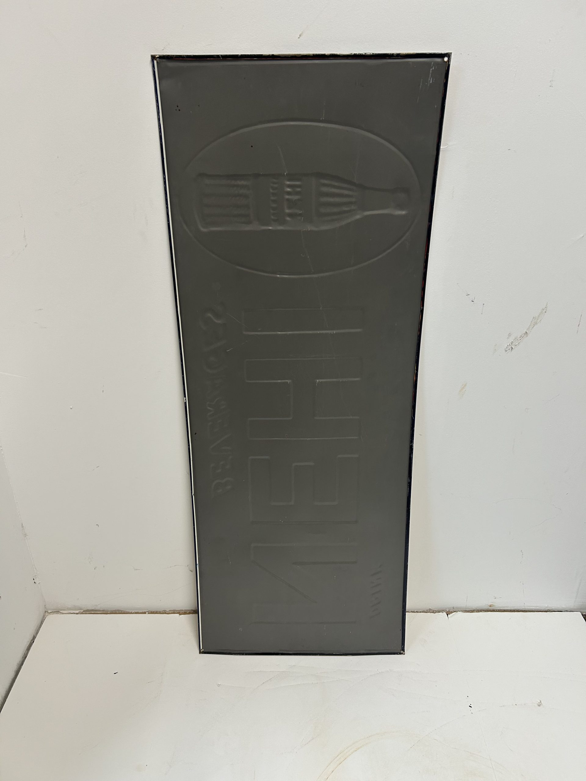 Drink Nehi Beverages vintage sign with yellow background and red and black lettering.