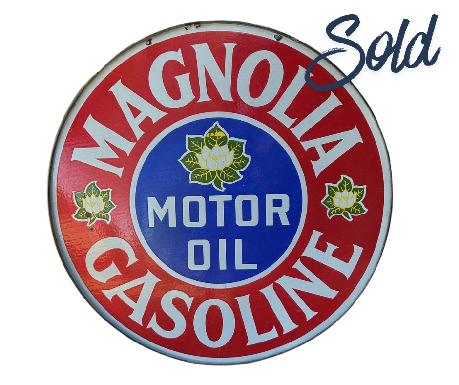 Magnolia porcelain signs were common advertisements for the Magnolia Petroleum Company, which was established in 1911, with signs being produced from the late 1920s through the early 1930s. These signs featured the company’s logo, which included a magnolia blossom, and were designed to be durable for outdoor use at gas stations and country stores. They were replaced in popularity by cheaper materials like tin and aluminum around the 1950s and 60s.Â