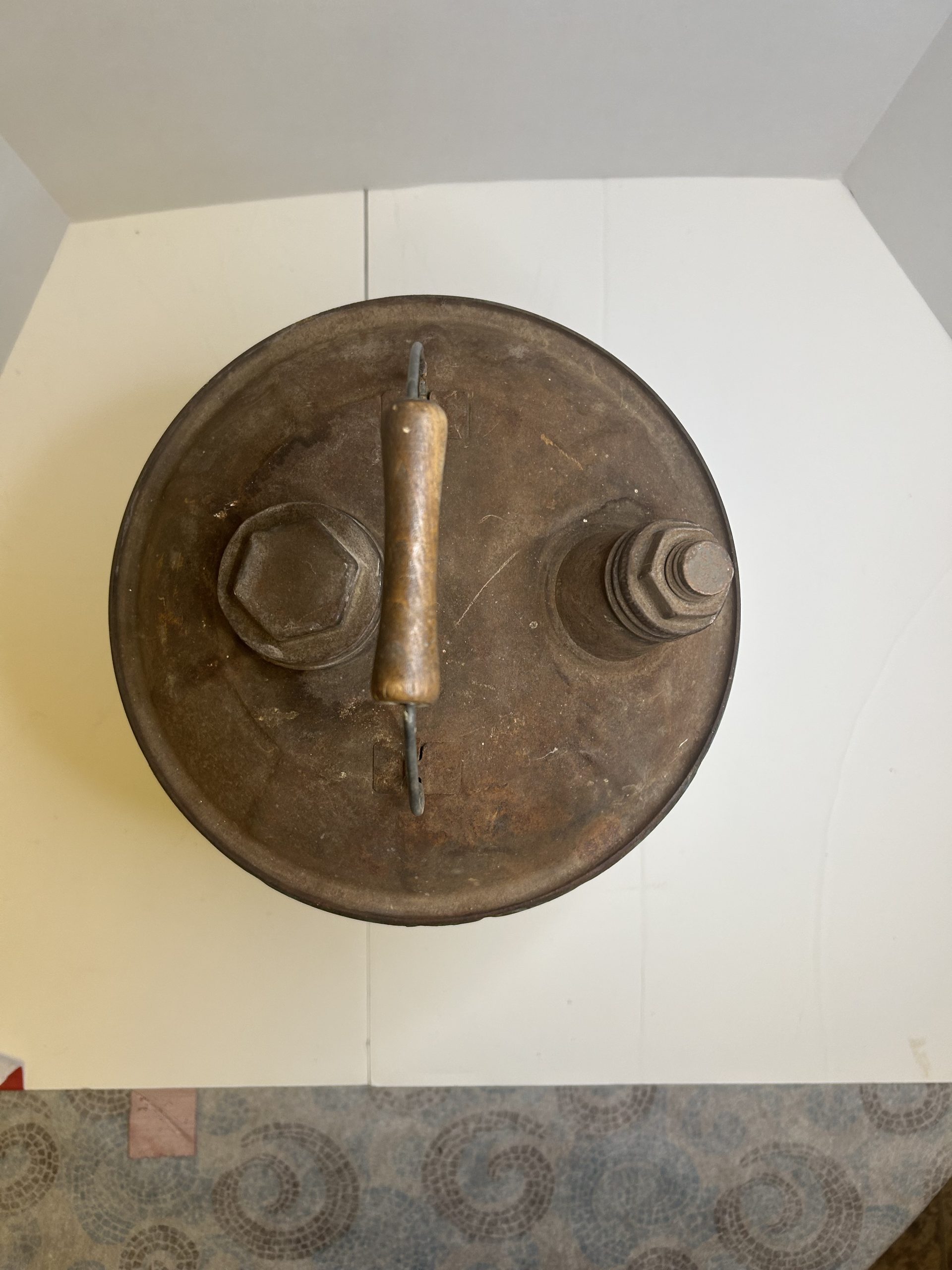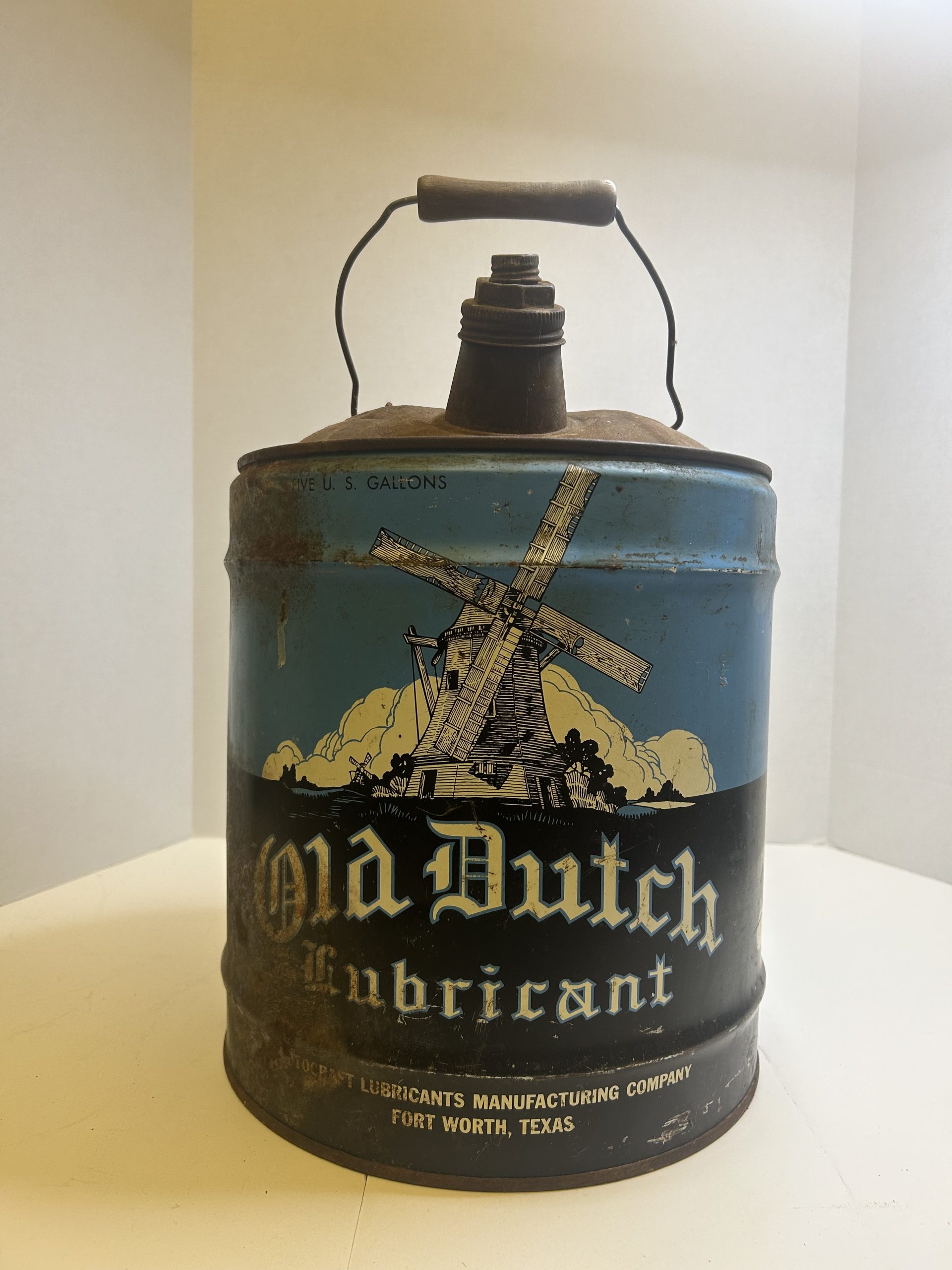 Old Dutch Vintage OIl Can, 5-gallon lubricants produced by Autocraft Lubricants Manufacturing Company Fort Worth, Texas painted metal with Windmill graphics on blue background, Old Dutch also produced motor oil and grease cans.