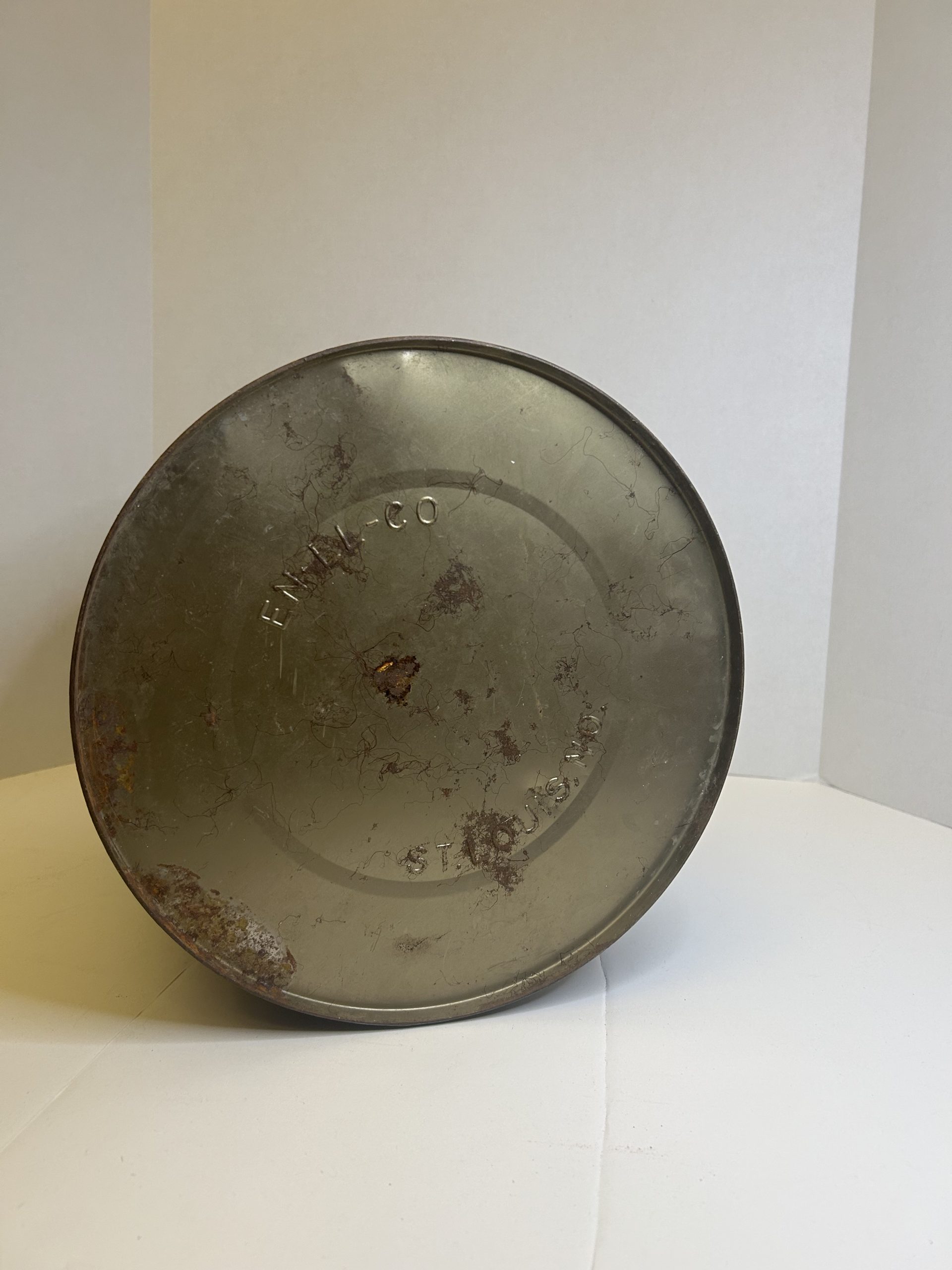 Can is empty. has scratches, small dents, rust and wear overall as can be seen in the pictures. one side is a lot nicer than the other. Can is not rusted through.